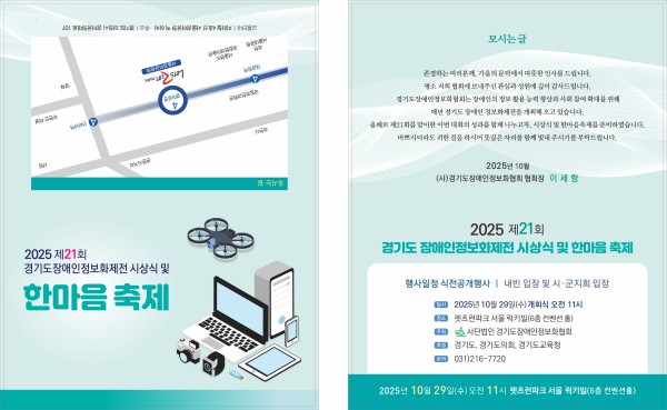 제21회 경기도장애인정보화제전 시상식 및 한마음축제 개최 작성자 정보 경기도협회 작성 작성일 2025.10.15 11:12 컨텐츠 정보 50 조회 목록 본문 - 제21회 경기도장애인정보화제전 시상식 및 한마음축제 개최 안내 - 행사일정 : 식전공개행사, 내빈 입장 및 시군지회 입장 일시 : 2025년 10월 29일 수요일 11시 장소 : 렛츠런파크 서울 럭키빌 6층 컨벤션홀 주최 : 경기도장애인정보화협회 관련자료 다음 제21회 경기도 장애인 정보화제전 심사 결과 안내 작성일 2025.09.04 13:30 댓글 0 등록된 댓글이 없습니다. 로그인한 회원만 댓글 등록이 가능합니다. 목록